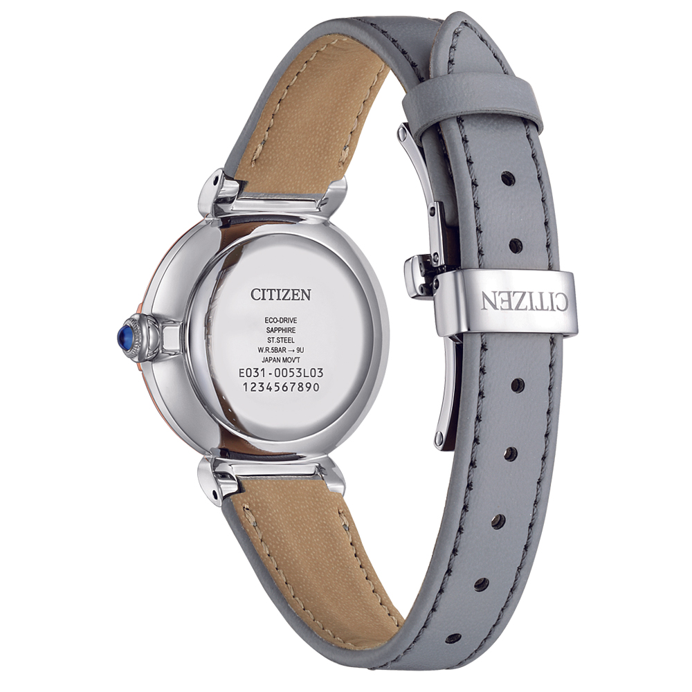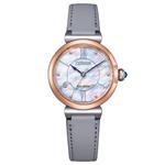 Damenuhr Citizen Marke Citizen Glasart Saphirglas Ziffernblattfarbe weiß - Perlmutt Schliesse Faltschließe Ref Nr.: EM1074-15D Bandart Lederband mit Dornschließe Durchmesser 29,5mm Wasserdichte 50 Meter Werkart ECO-Drive (Solar) Ziffernblattzeichen Analog, 3-Zeiger ohne Datum Material Edelstahl, PVD roségoldEdelstahl, poliert -