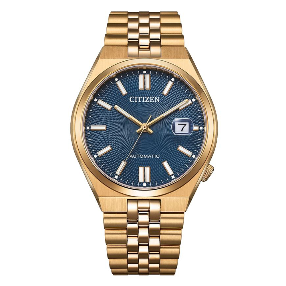 Herrenuhr Tsuyosa Citizen Marke Citizen Glasart Saphirglas Ziffernblattfarbe blau Schliesse Faltschließe Ref Nr.: NK0023-57L Bandart Jubileé-Band Durchmesser 40mm Wasserdichte 50 Meter Werkart Automatik Ziffernblattart Strich Ziffernblattzeichen Analog, 3-Zeiger mit Datum Material Edelstahl, roségold plattiert -