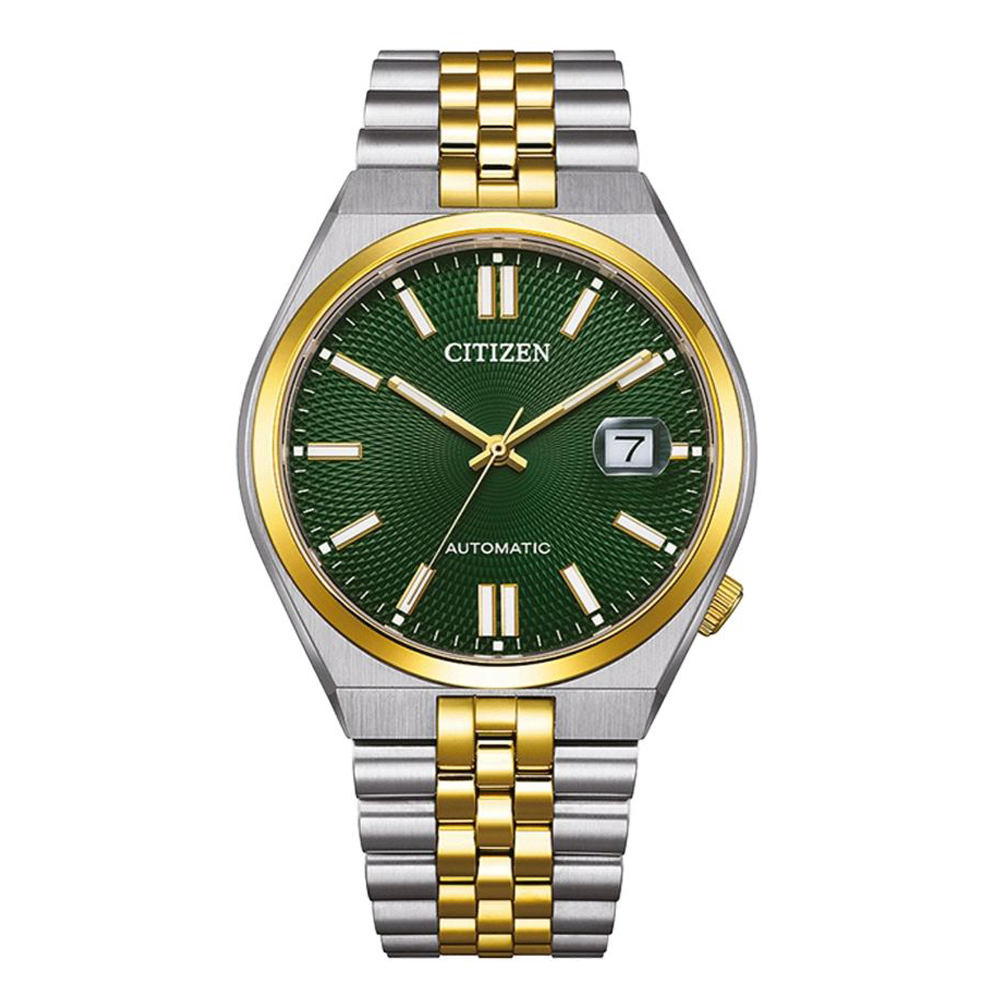 Herrenuhr Tsuyosa Citizen Marke Citizen Glasart Saphirglas Ziffernblattfarbe grün Schliesse Faltschließe Ref Nr.: NK0024-54X Bandart Jubileé-Band Durchmesser 40mm Wasserdichte 50 Meter Werkart Automatik Ziffernblattart Strich Ziffernblattzeichen Analog, 3-Zeiger mit Datum Material Edelstahl, mattEdelstahl, gold plattiert -