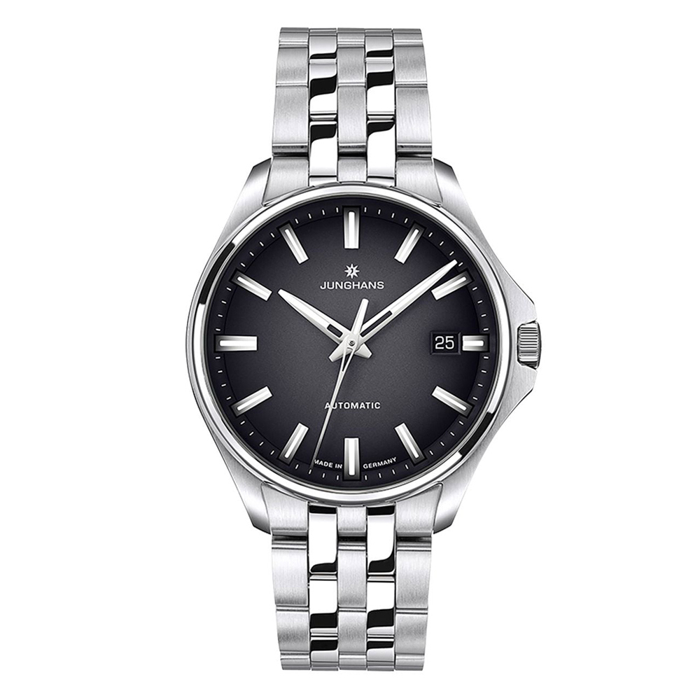 Junghans Meister S 36 Automatik Marke Junghans Glasart Saphirglas Ziffernblattfarbe grau Schliesse Faltschließe Ref Nr.: 27/4580.44 Bandart Gliederband Durchmesser 36mm Wasserdichte 100 Meter Werkart Automatik Ziffernblattart Strich Ziffernblattzeichen Analog, 3-Zeiger mit Datum Material Edelstahl, matt/poliert -