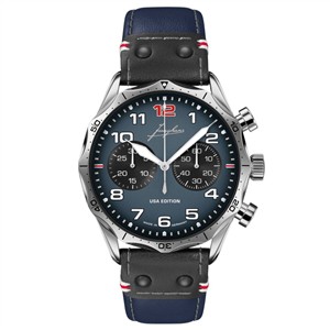 Junghans Meister Pilot Chronoscope Edition Marke Junghans Glasart Saphirglas Ziffernblattfarbe blau-schwarz Schliesse Dornschließe Ref Nr.: 27/3496.00 n.m.l. Bandart Lederband mit Dornschließe Durchmesser 43,3 Wasserdichte 100 Meter Werkart Automatik Ziffernblattart arabisch Ziffernblattzeichen Analog, Chronograph Material Edelstahl, poliert -