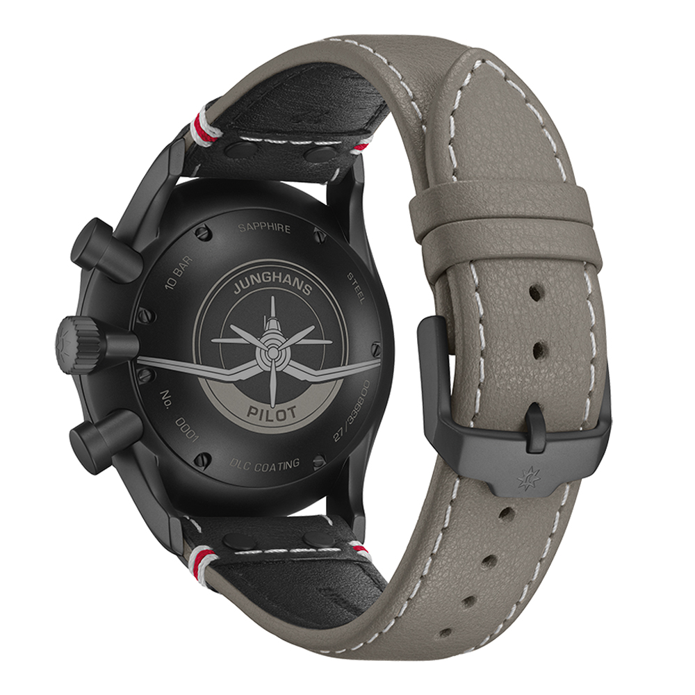 Junghans Meister Pilot Chronoscope Desert Marke Junghans Glasart Saphirglas Ziffernblattfarbe beige Schliesse Dornschließe Ref Nr.: 27/3398.00 Bandart Lederband mit Dornschließe Durchmesser 43,3 Wasserdichte 100 Meter Werkart Automatik Ziffernblattart arabisch Ziffernblattzeichen Analog, Chronograph Material Edelstahl, schwarz -