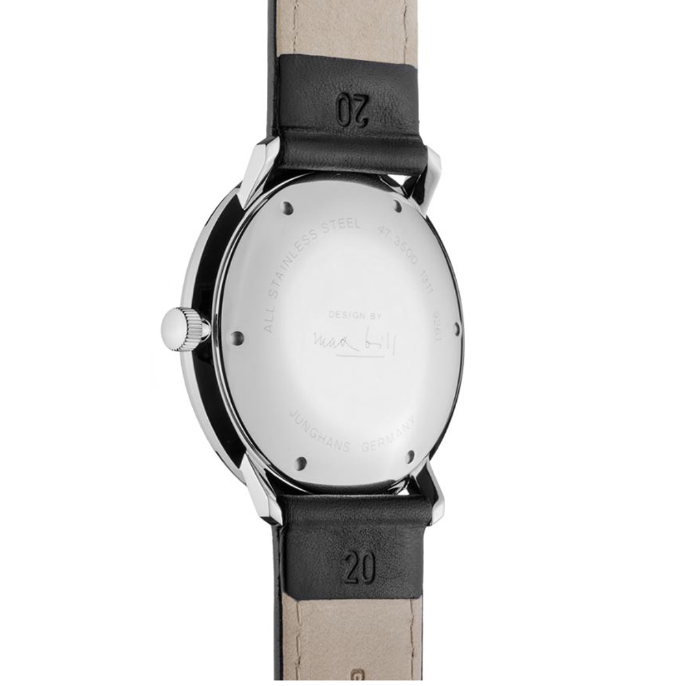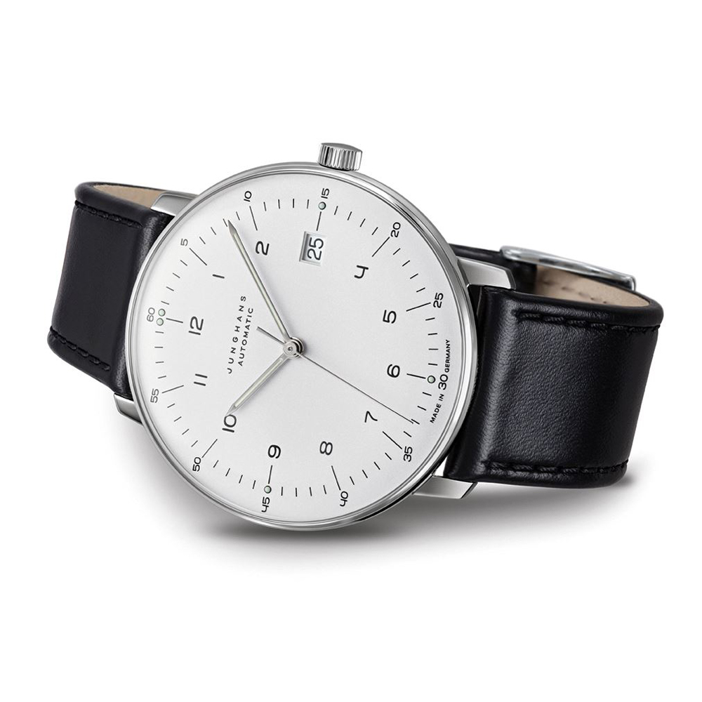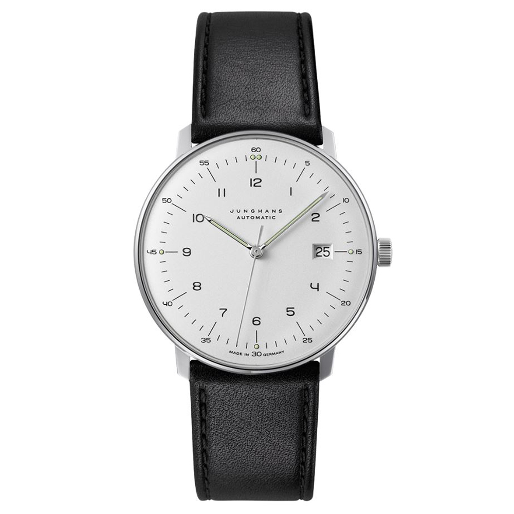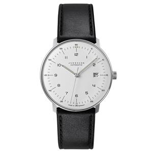 Junghans Max Bill Automatik Marke Junghans Glasart Saphirglas Ziffernblattfarbe weiß Schliesse Dornschließe Ref Nr.: 27/4700.02 Bandart Lederband mit Dornschließe Durchmesser 38mm Wasserdichte 50 Meter Werkart Automatik Ziffernblattart arabisch Ziffernblattzeichen Analog, 3-Zeiger mit Datum Material Edelstahl, poliert -
